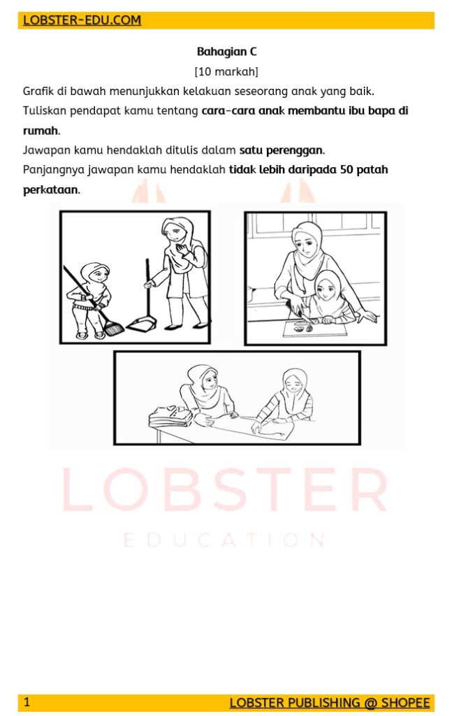 Latihan ini disediakan khas untuk murid Tahun 5 dan Tahun 6 sebagai persediaan menghadapi Ujian Akhir Sesi Akademik (UASA) Bahasa Melayu. Soalan Bahagian C ini menguji kebolehan murid menulis karangan pendek satu perenggan berdasarkan gambar bertajuk cara anak membantu ibu bapa di rumah. Jawapan tidak melebihi 50 patah perkataan.