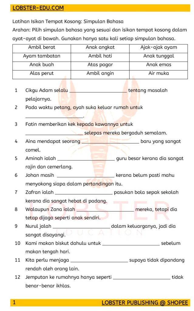 IGCSE Malay, Simpulan Bahasa, Idioms, Bahasa Melayu, Vocabulary, Fill in the Blanks, Lobster Education, Worksheet PDF, UASA, Secondary School