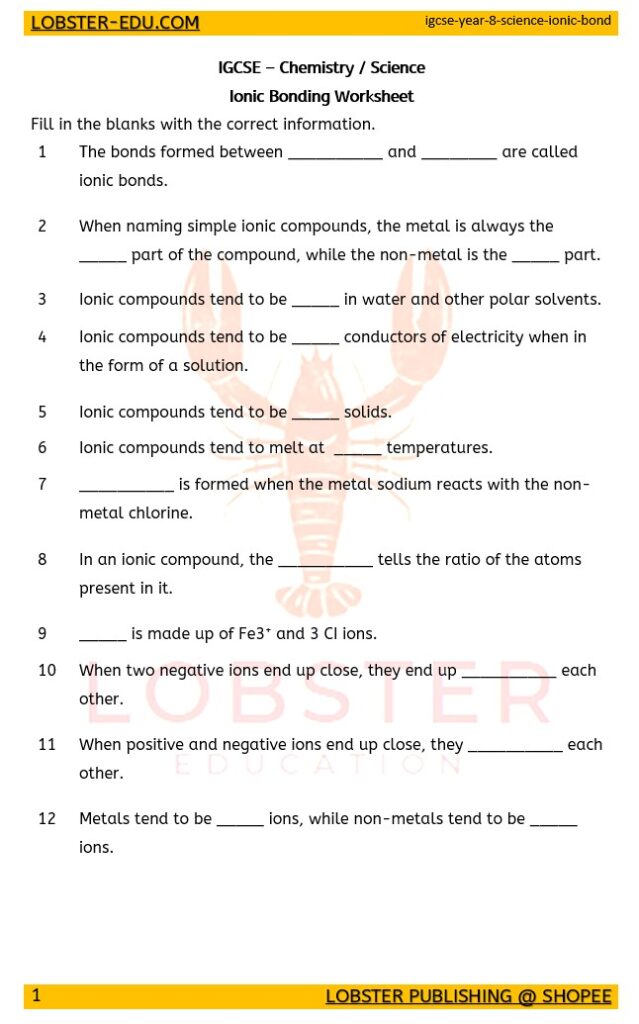 This worksheet is ideal for classroom use, homework, or exam revision. Teachers can use it to assess understanding before moving on to covalent and metallic bonding topics.