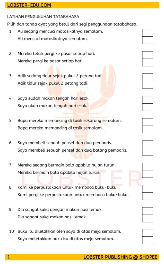 This IGCSE Malay Foreign Language grammar worksheet helps students strengthen their understanding of tatabahasa (grammar). Learners are asked to choose the correct sentence based on proper usage of tenses, time expressions, and sentence structure — perfect for Cambridge IGCSE Malay Paper 2 (Writing) and Paper 3 (Reading & Writing) revision.
