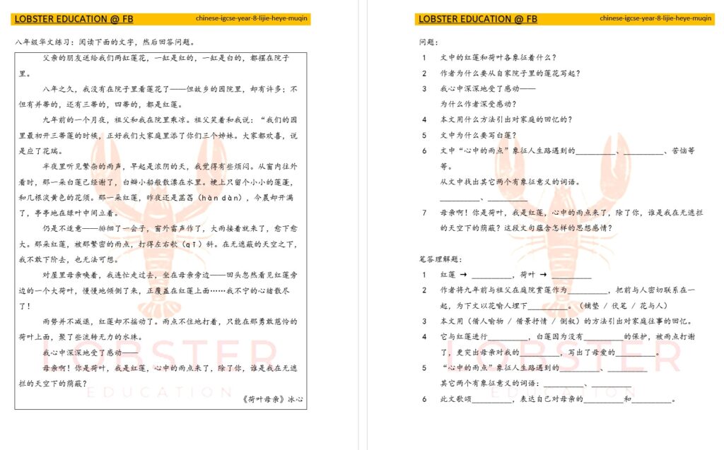这是一份IGCSE八年级华文阅读理解练习,课文选自冰心的《荷叶母亲》。文章以院子里的红莲和荷叶为象征,抒发作者对母爱的深切感受。练习共设7道问答题及笔答理解题,涵盖象征意义、写作手法、词语理解及思想感情分析等考点,全面提升学生的文学赏析及应试能力。适合IGCSE华文备考及课堂练习。免费下载,尽在lobster-edu.com。